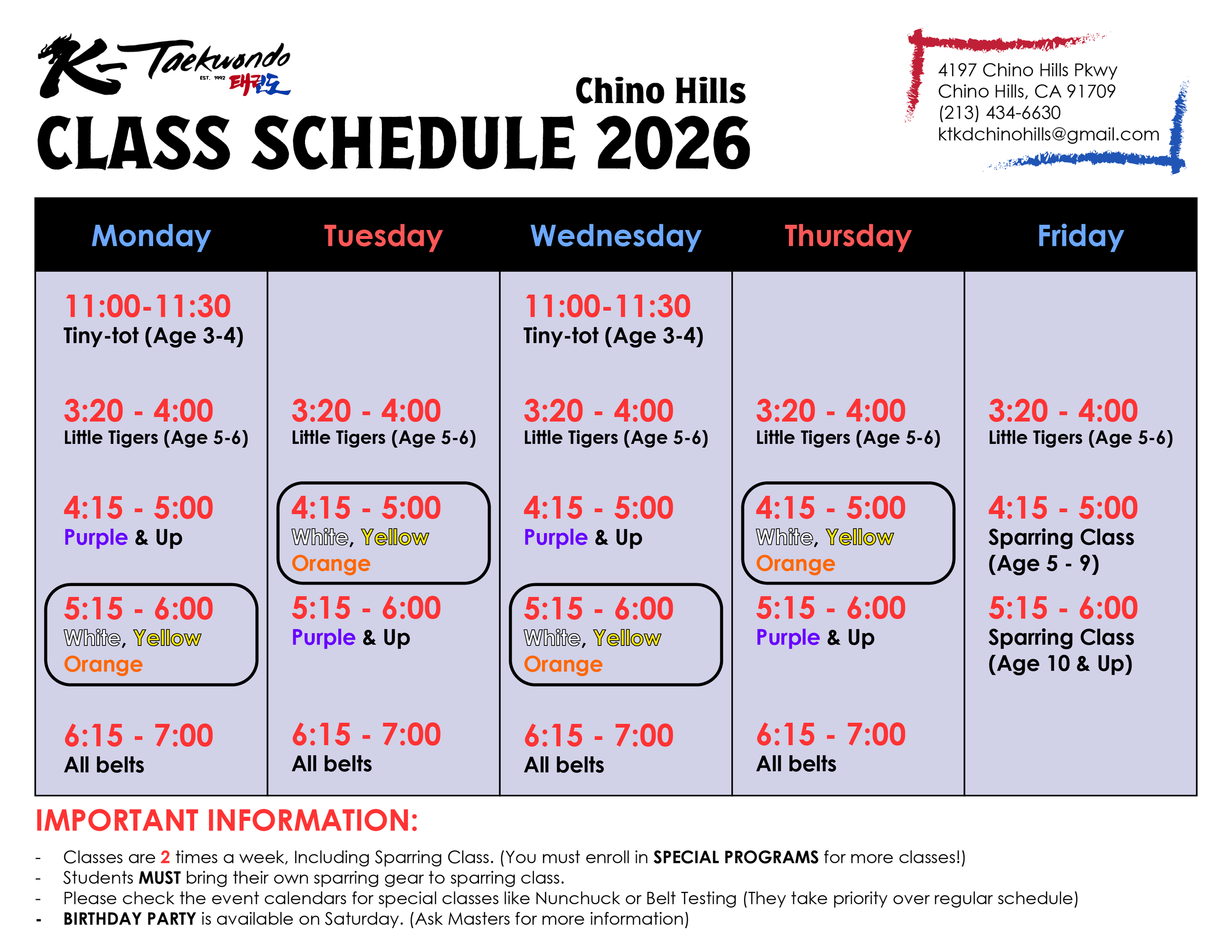 Any and All updates to the Schedule and Monthly Calendar will be posted here. Keep an eye on events as those take priority over the usual class schedule.