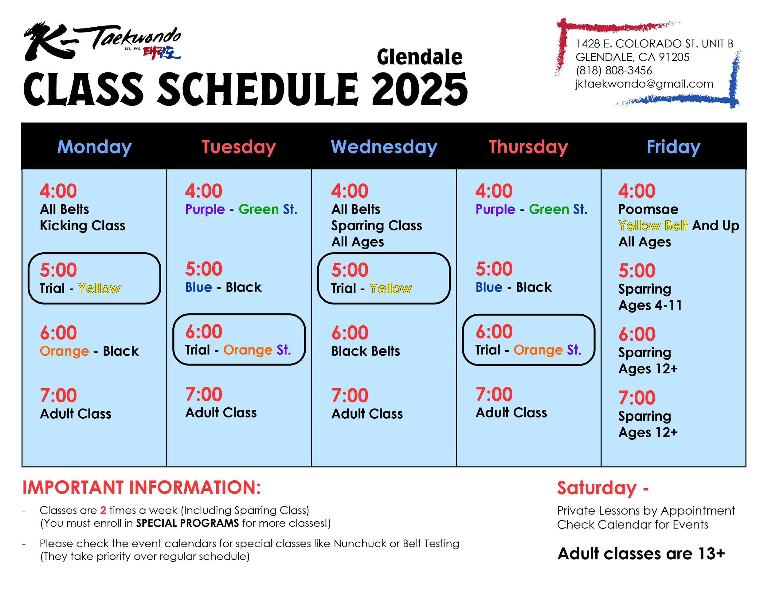 Any and All updates to the Schedule and Monthly Calendar will be posted here. Keep an eye on events as those take priority over the usual class schedule.